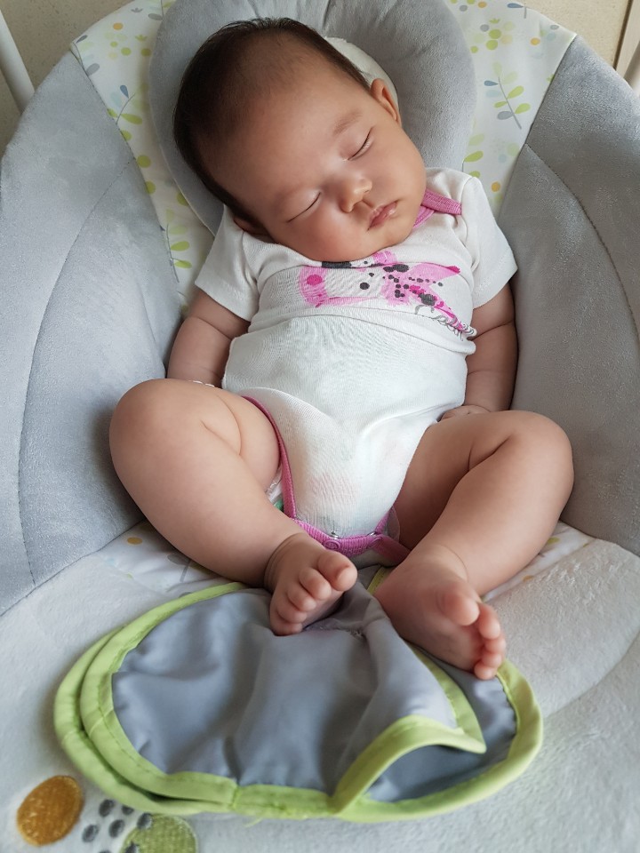 바운서에 앉아서 목이 꺾어져라 잘때도 있어요..ㅎㅎ.. 너무 웃기긴 하더라구요. 그런데 평소에는 이렇게 잘 자지 않아요 ㅠㅠ... 낮잠도 안아서 재우거나, 바운서를 흔들어줘야 거기서 잠깐 한 30분정도 자고, 길면 한시간이에요 ㅠ_ㅠ..