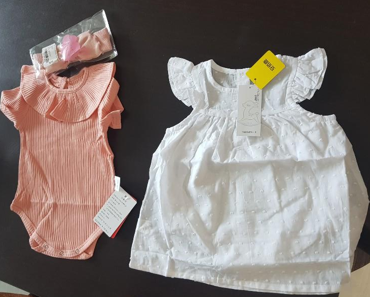 받아 본 옷이에요. 흰 원피스와 살구색에 가까운 옷과 리본..ㅎㅎ 진짜 여자아기가 입어야 할만한 옷과 머리띠였어요. 저는 나름 아니 여자 남자가 입어야 하는 옷이 정해져있는게 편견이라고 우기면서 버텨온건 아닐까요..?