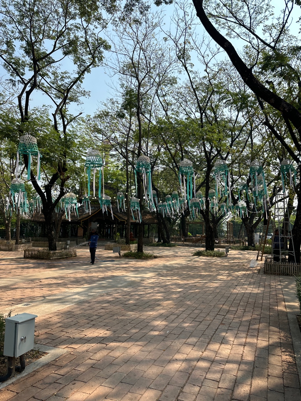 다시 밖으로 나와 주말이면 플리마켓의 마켓들이 즐비할 거리들을 쭈욱 걸어보기도하고 뛰어도보고 분수도 구경하고, 주변정리하는 태국분들이랑 인사도하고 놀았답니다. 우기도 아닌데 콘도도 길거리의 풀들도 나무들도 어떻게 저렇게 푸르게 유지가 될까했는데 이유를 알았답니다.! 세상마상에나 스프링쿨러가 곳곳에 설치되어있고 징짜이마켓에도 물주시는 분들이 거의 6분이나 계시더라구요 (저희가 본것만 6분..ㄷㄷ)