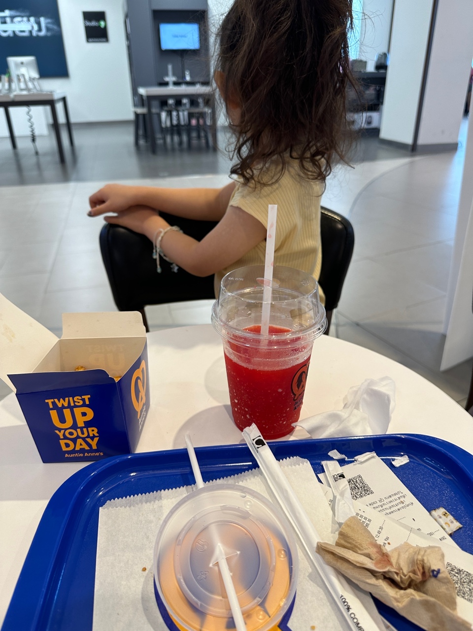 마야몰 지하 1층으로 가시면 많이들 가시는 림핑마켓부터 프드코트도 있어요..! 지하 1층 푸드코트는 전세계 국룰인가봅니다..? 하지만 3층인가 4층쯤 갔을때였나 앤티앤스가 있는거에요! 저와 저희 딸의 최애입니다..하하. 사실 크림치즈 아몬드 스틱이 국룰인데.. 흠 없더라구요? ㅠ_ㅠ.. 그래서 기본 아몬드 프레즐을 먹고, 물론 또한번 더 시켰땁니다. 가격 착한거 진짜 후 ㅠㅠ 물가대비겠지만... 항상 음료없이 프레즐 2개만 사도 만원이상 내다가 프레즐이랑 칠러,레몬에이드 시켰음에도 불구하고5 천원정도도 안나오는데 감동아닙니까..?