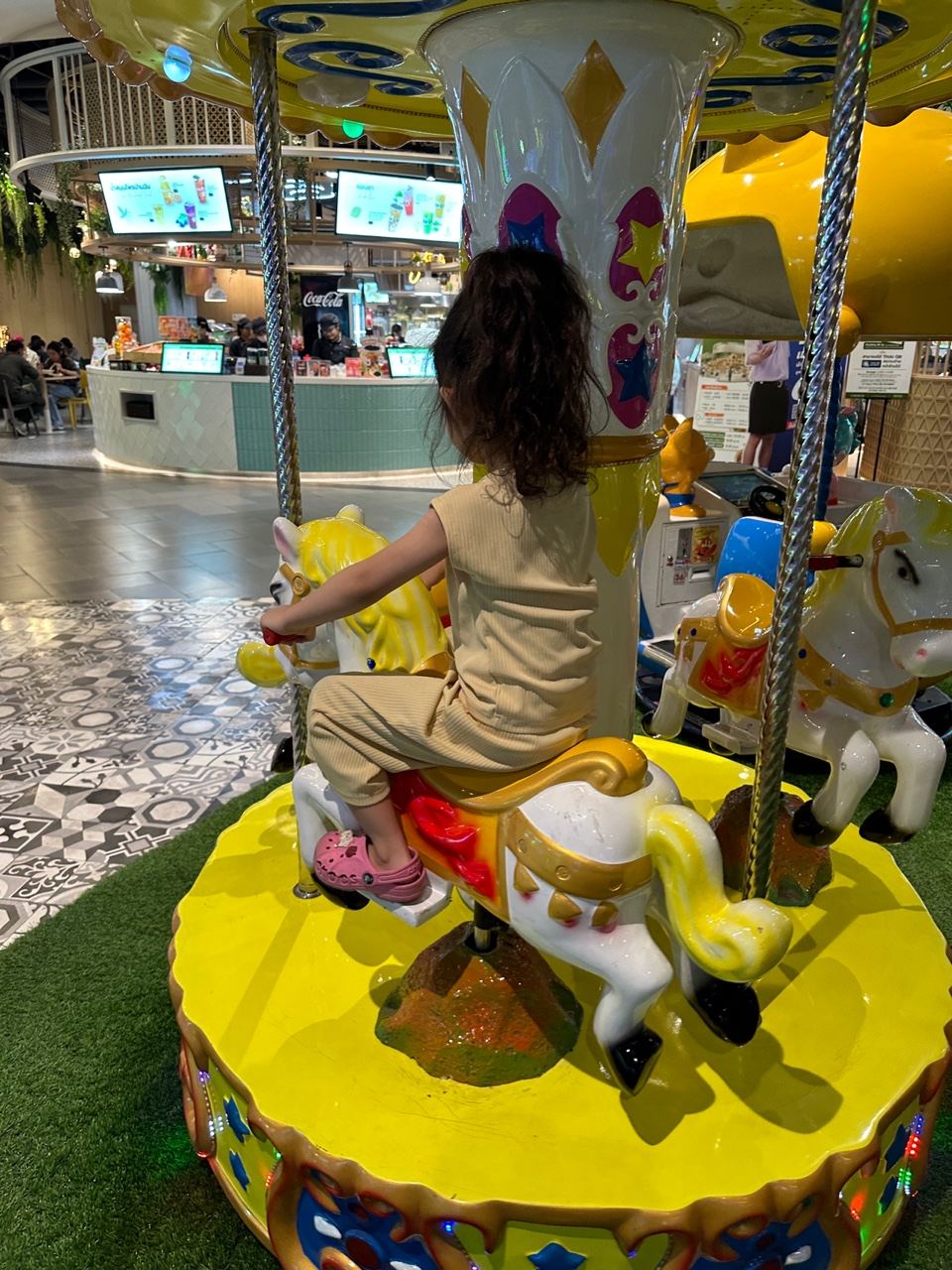 여기가 3층인가 4층인가.. 아이들이 노는 곳이 있어요. 신기하게 현금을 넣는게 아니라 우리나라 동전바꾸는 기계같은거에 바트를 넣으면 코인같은거로 줍니다. 그걸 몇개씩 넣어야하는데 센트럴치앙마이와 다르게 여기는 하나씩만 넣음 되는 기계들이 많고, 이런 회전목마는 2개를 써야하더라구요..! 10바트에 코인 1개입니다.